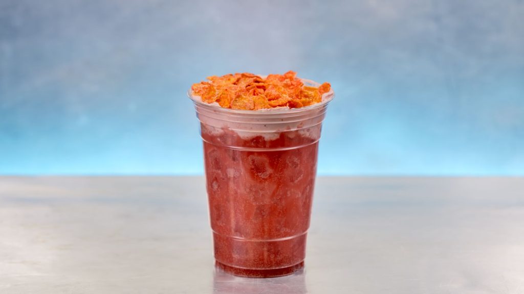 Sprite con crema de fresa y coco hecha en casa, coronada con crema de fresa y hojuelas sabor fresa. (Sin alcohol / Nuevo)